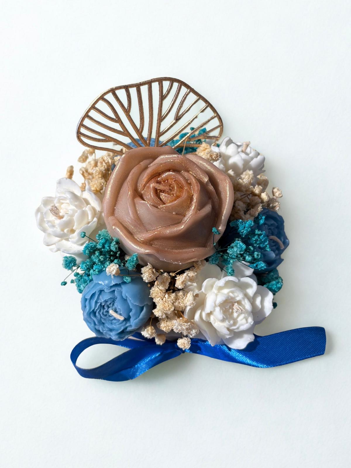 Apportez élégance et parfum à votre intérieur avec ce bouquet de bougies artisanal. Chaque fleur rose, pivoines et dahlias sont minutieusement façonnée à la cire d’abeille et dégage une douce odeur de mille fleurs sauvages. Dans de jolies teintes bleu, blanc et doré, ce bouquet est présenté dans une élégante boîte dorée, idéal pour offrir ou sublimer votre décoration.