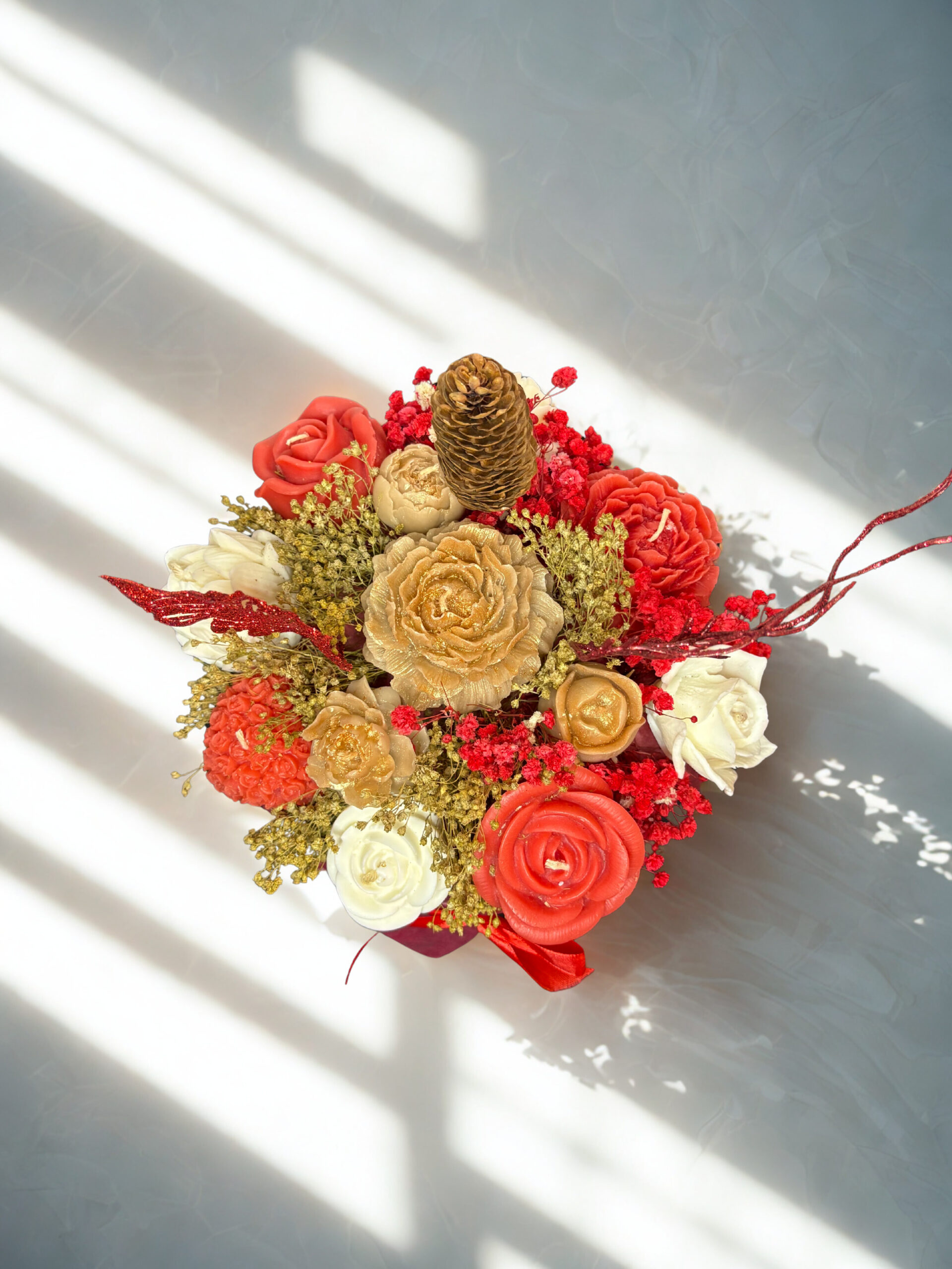 Apportez élégance et parfum à votre intérieur avec ce bouquet comportant 12 bougies artisanal. Chaque fleur sont minutieusement façonnée à la cire d’abeille et dégage une douce odeur de mille fleurs sauvages. Dans de jolies teintes (rouge, blanc, doré et noir) ce bouquet est présenté dans une élégante boîte noir, idéal pour offrir ou sublimer votre décoration.