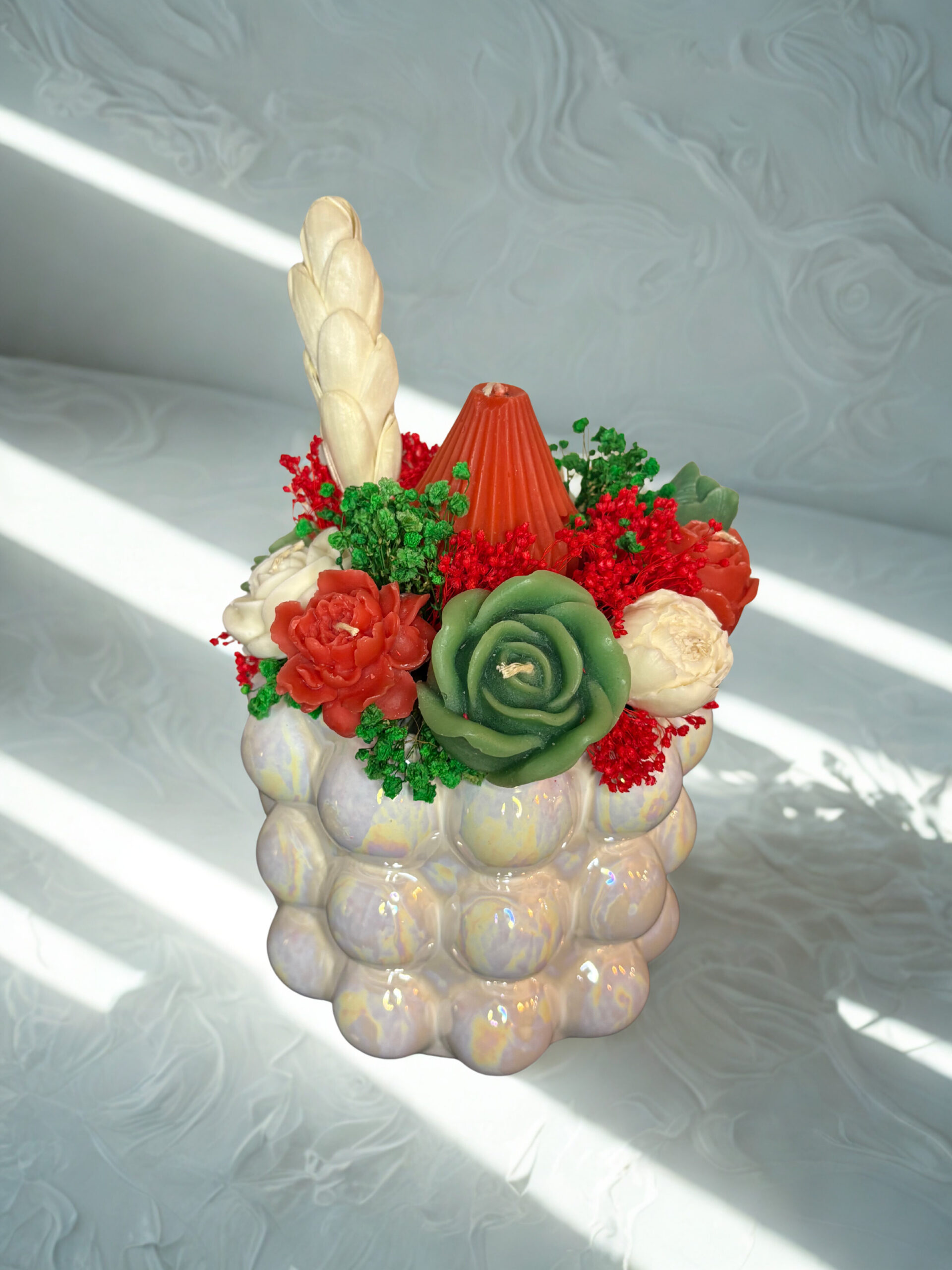 Apportez élégance et parfum a votre intérieur avec ce bouquet comportant 10 bougies artisanal. Chaque fleur sont minutieusement façonnée à la cire d’abeille et dégage une douce odeur de mille fleurs sauvages et musk lil. Dans de jolies teintes (rouge, blanc et vert), ce bouquet et présenté dans un élégant vase blanc de 19 cm de diamètre, idéal pour offrir ou sublimer votre décoration.